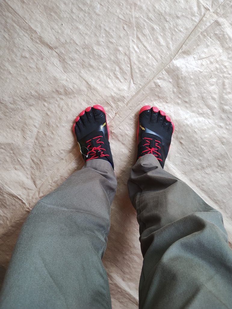 ベアフットシューズは各シューズメーカーから発売されていますが、まだまだ少数です。その中でも今回の試着&販売会でお目にかかったのが「ビブラムファイブフィンガーズ」というシューズ(シリーズ)。靴のソールやインソールで有名なビブラム社が開発した、シューズのつま先が指の形に分かれているユニークな形状のものです。